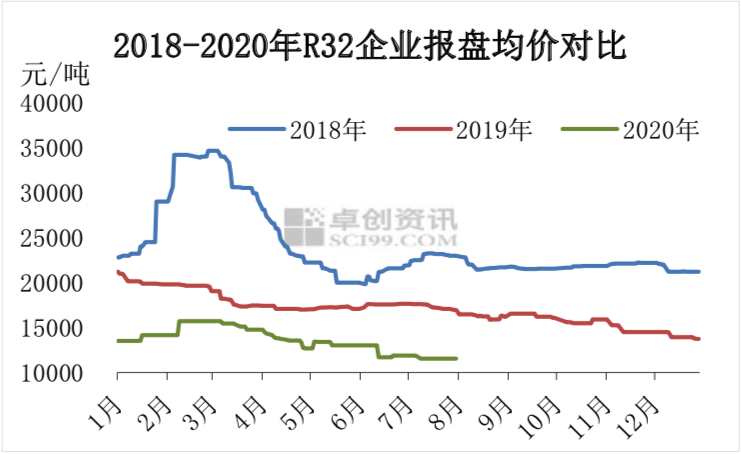 本周,國内制冷劑 R32 市場穩定運行,價格低位 維穩。供應方面,由于産能過剩現象嚴重,企業開工 低位,市場供應平穩。需求方面,受空調生産旺季延 期影響,需求呈現緩慢下降趨勢。原料方面,無水氫 氟酸價格保持穩定,成本面形成穩定支撐。但價格持 續低位,利潤低,價格下降空間有限,所以整體市場 處于低位穩定運行。截至本周四,國内制冷劑 R32 生 産企業報盤價格在 10200-12500 元/噸,華東市場實 際成交價格集中在 11000-11200 元/噸。