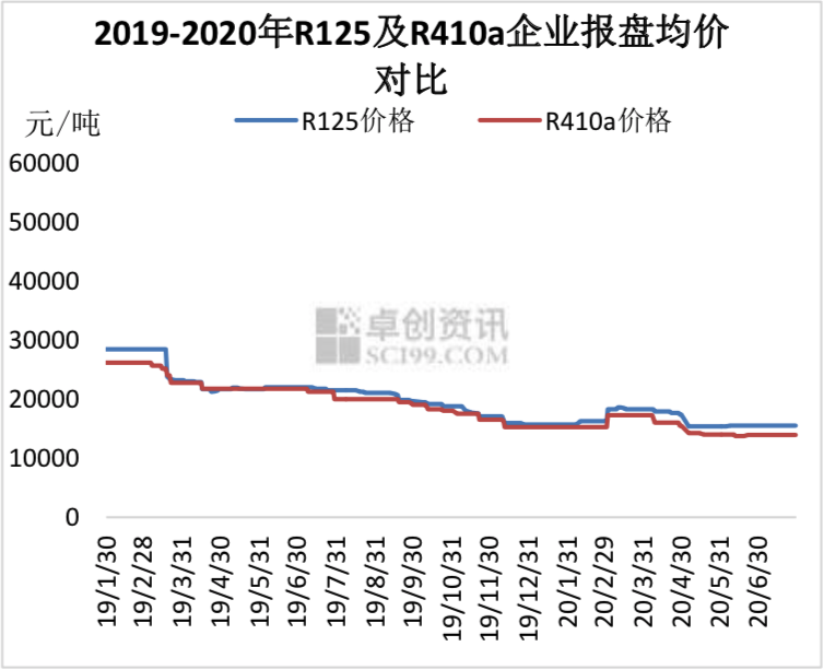 本周,國内制冷劑 R125 市場穩定運行,主要用來混 配合成制冷劑 R410a。混配制冷劑 R410a 市場穩定運行, 需求小幅下降,一方面,R32 價格延續低位穩定狀态, 基礎原料氫氟酸價格周内價格低位維穩,但由于 R125 企 業開工低位,實際成交價格出現小幅上漲,成本面支撐 穩定。另一方面,空調生産以及售後市場需求減弱,整 體需求欠佳。截至本周四,生産企業 R125 報盤價格圍繞 在 15000-16000 元/噸,華東地區實際成交價格集中在 14500-15000 元/噸;R410a 報盤價格在 13800-14000 元 /噸,華東地區市場成交價格集中在 12500-13000 元/噸。