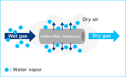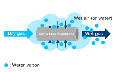 sunsep™的中空纖維,具有使膜内側和外側空氣(氣體)之間産生的濕度差(水蒸氣壓差)變得相等的性質,使水蒸氣從濕度高的一側向低的一側移動。